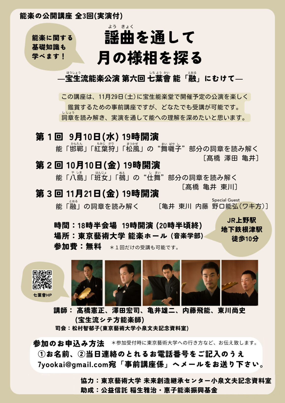 なお、本講座は、2025年11月29日(土)に宝生能楽堂で開催する能楽公演「宝生流能楽公演 第六回七葉會 能「融」―月の様相を探る―」をよりたのしく鑑賞するための事前講座ですが、本講座はどなたでも参加が可能です。この講座を通して、観客のみなさまが「能楽公演」を楽しめるきっかけになればと考え、協力させていただきました。